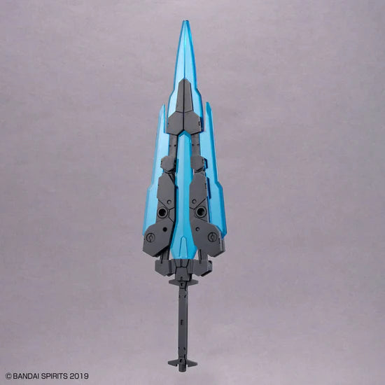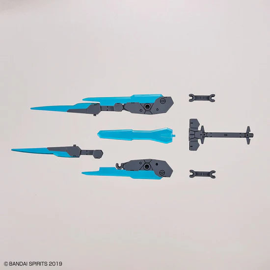 The combined sword is equipped with a deployment gimmick. If disassembled, it can be used as a small sword or customized part. Medium-sized swords can be selected from various shapes of blades. The blade parts are available in two colors: clear blue and gray.