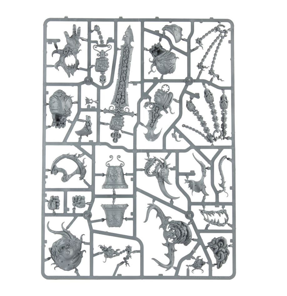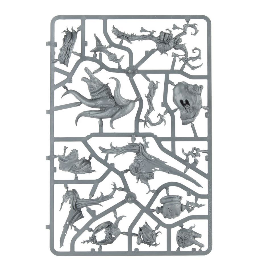 This multi-part plastic kit contains the components necessary to assemble a Great Unclean One. This is a truly vile model (in the most positive sense of the word!) – it celebrates its corpulence, with rotten, torn flesh slipping aside on its enormous gut to reveal winding intestines within. 2 different heads are available – one with symmetrical antlers and a foul grin, and one cyclopæan, featuring a hideous daemon tongue which ends in a sinister head – itself featuring a sinister daemon tongue! It can be armed with a massive bilesword or doomsday bell in the right hand, and a large bileblade or plague flail (a remarkable object which is essentially 3 skulls attached to lengths of heavy chain) in its left hand. 6 Nurglings are included, clutching items such as censers, or just hanging about – these can be added to the kit in any way that you see fit.