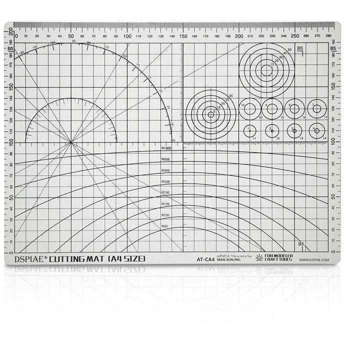 Soft PVC material is used for both sides of this cutting mat with Hard PVC in the middle. This cutting mat is designed for model making, with scaleplate and ruling on the surface. The surface material is soft as to protect your cutting blade and prolong it's life while also protecting your desk from the blade you are using. Roughly 8.5x12 inches this is the smallest mat that DSPIAE offers and should be able to cover only what you wish it to.