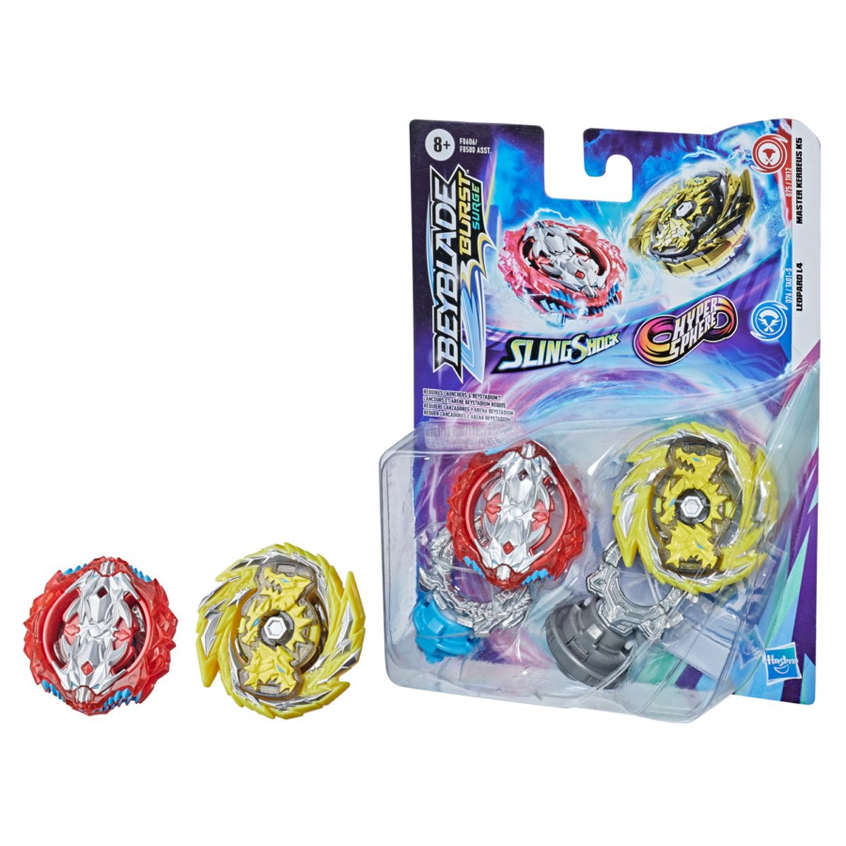 Get ready for a match with the Beyblade Burst Surge SlingShock Hyper Sphere Leopard L4 vs. Master Kerbeus K6 Tops! Set includes all the parts you need to assemble and customize two tops. Launcher not included, sold separately. Ages 8 and up.