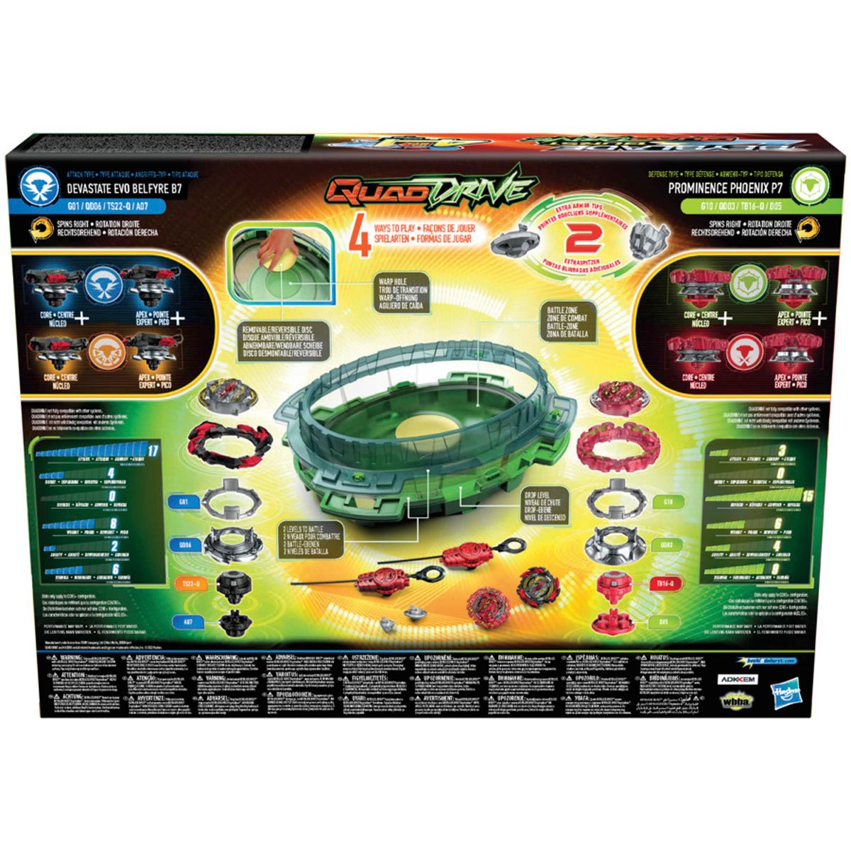 Beyblade QuadDrive tech puts the future of Beyblade battling in your hands with the first ever 4-in-1 top! Beyblade Burst QuadDrive Battle Set for ages 8 and up. The first ever 4-in-1 top gives you 4 ways to strategize, 4 ways to customize, 4 ways to battle, and 4 ways to win! The QuadDrive battle system consists of 2 levels: battle on the top level, then drop through the center and take the clash to the lower level. Includes QuadDrive Beystadium, 2 specially designed QuadDrive tops, and 2 launchers. Scan the code to unlock in the Beyblade Burst app. Ages 8 and up.