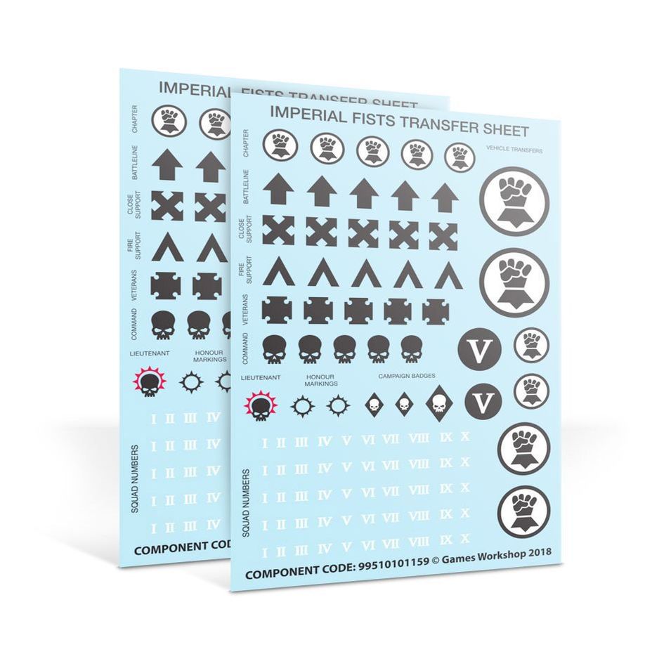 The included Transfer Sheet features the Imperial Fists Chapter icon, markings for battlefield roles, numbers, and scripture. They also include larger decals for vehicles and iconography for Crimson Fists successor Chapter.